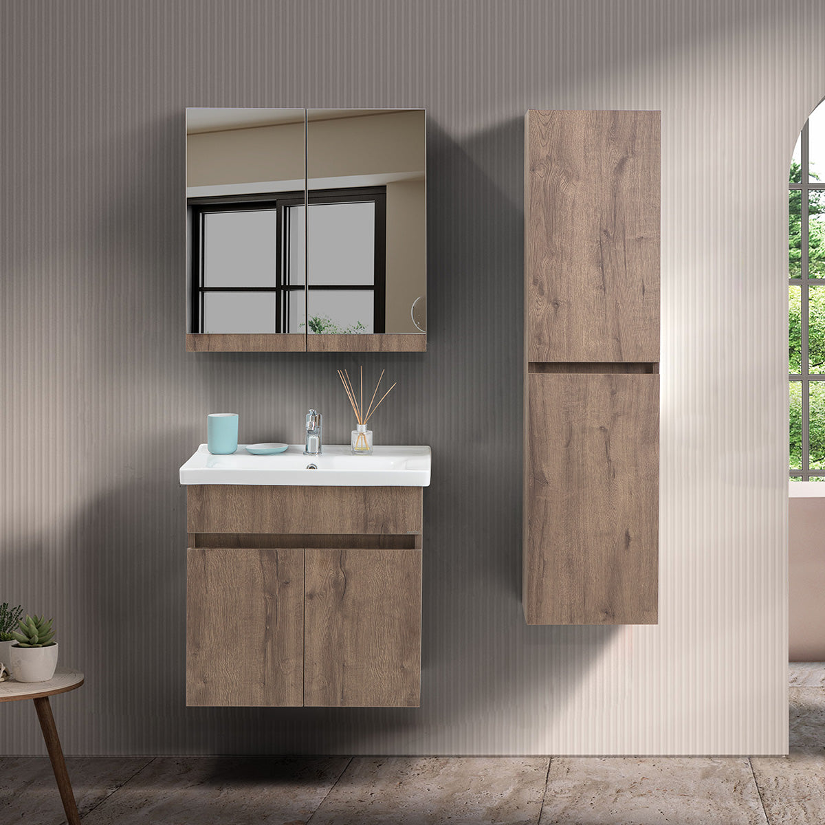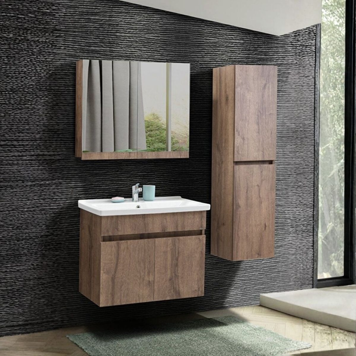 Mona Kahverengi Banyo Dolabı Seti, banyolarınızda sade şıklığı ve işlevselliği bir araya getirir. Set; lavabolu alt dolap, aynalı üst dolap ve boy dolabından oluşur. Duvara monte yapısı sayesinde zeminde ferahlık sağlar, temizlik kolaylığı sunar.