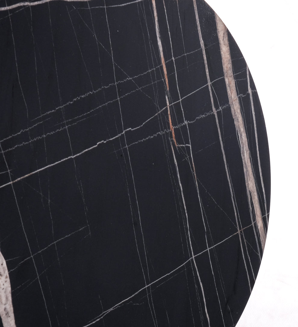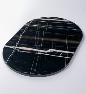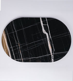 Modern yaşam alanları için tasarlanan siyah mermer desenli oval dekoratif tabla, şıklığı ve fonksiyonelliği bir arada sunar.