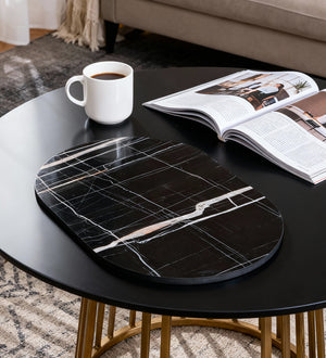 Siyah Mermer Desenli Oval Dekoratif Tepsi | Modern Orta & Yan Sehpa Üstü Tabla